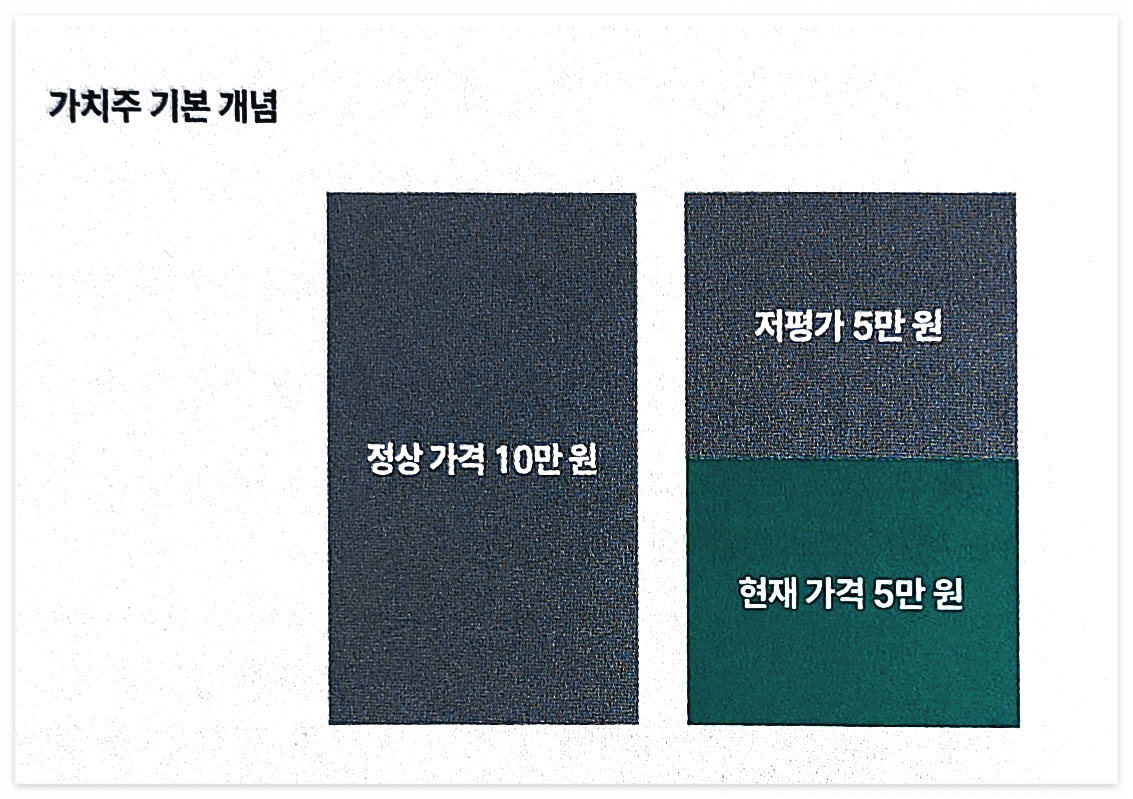 가치주는 과거 실적이나 자산가치를 기준으로 현재 주가가 싸다고 판단되는 주식이다. 예를 들어, 어떤 기업이 안정적인 수익을 내고 있으며 회계 장부상 1주당 순자산가치가 10만 원인데, 현재 주가는 5만 원이라면 이는 전형적인 가치주에 해당한다.