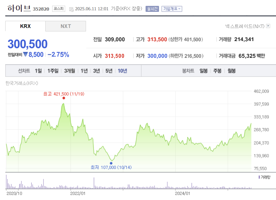 아래 그래프는 하이브의 상장 이후 주가 흐름입니다.