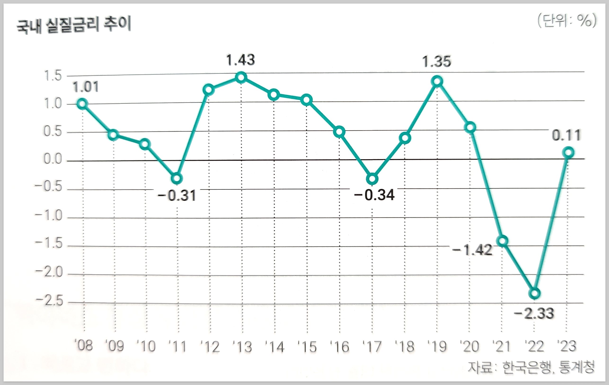 2008년부터 2023년까지 국내 실질금리는 등락을 반복하며 2011년, 2015년, 2021년에는 마이너스 실질금리를 기록한 해도 있었습니다.